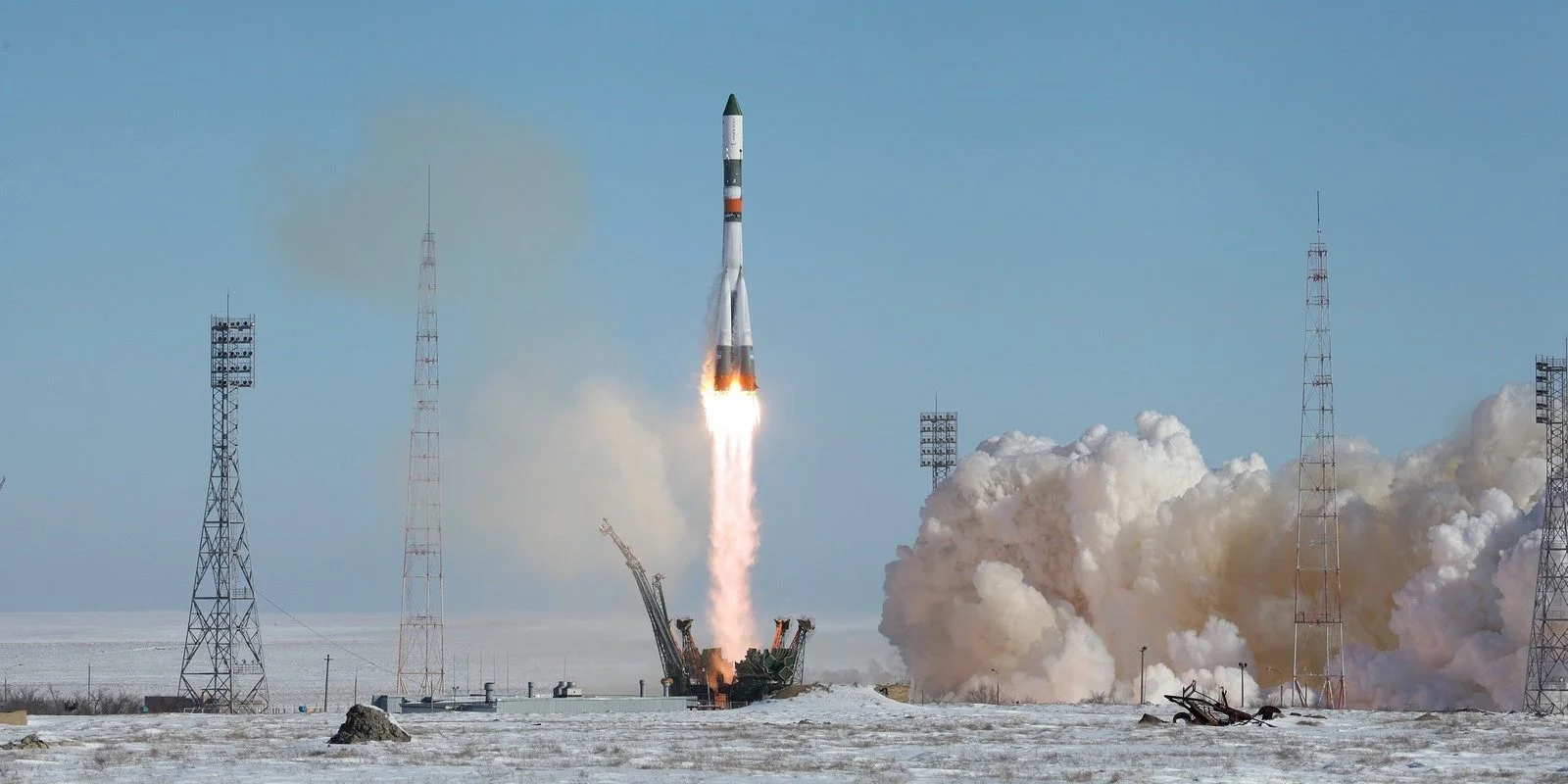 Seconds before liftoff, the core stage engine and also the four strap-on boosters ignited and throttled up to full power. Once the countdown reached zero, the launch mount released the rocket and it soared skyward, leaving behind the snow-covered Kazakh steppe where Baikonur is located.