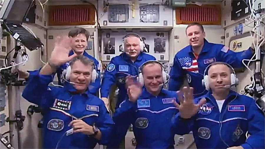 The two groups greeted each other with smiles and hugs before moving to the Zvezda service module for a post-docking conference with friends and family members on the ground in Baikonur Cosmodrome.