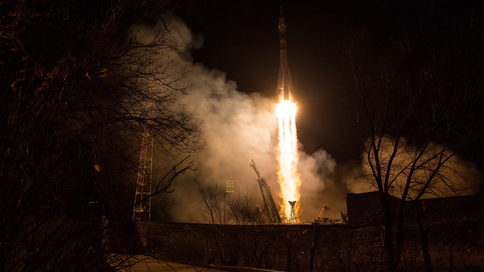 /Lighting up the Kazakh Steppe at the Baikonur Cosmodrome in Kazakhstan, three fresh International Space Station crew members launched toward space to begin a two-day chase of the orbiting outpost. Soyuz MS-08 launched at 1:44 p.m. EDT (17:44 GMT) March 21, 2018.