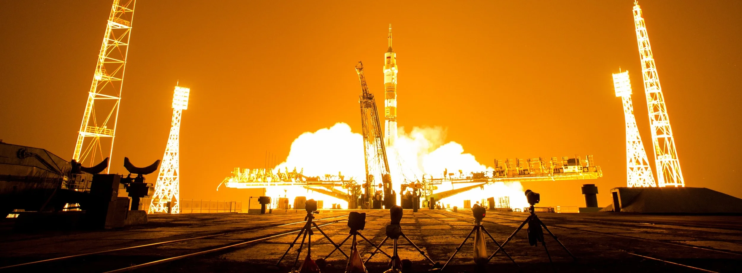 The spacecraft launches from Baikonur Cosmodrome in Kazakhstan via a Soyuz rocket. After assembling the spacecraft and rocket, the process leading up to launch, including loading some 300 tonnes of propellent, takes hours. Once the engines fire and vehicles starts to move, the whole ride to orbit lasts about nine minutes.